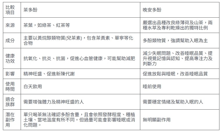 茶多酚是茶葉中多酚類的總稱,其中以黃烷醇類物質(兒茶素)最為重要,還包含茶黃素、單寧等化合物,因有抗氧化作用,能降低自由基攻擊、降低血壓、降低血膽固醇與低密度脂蛋白、降低第2型糖尿病、粥狀動脈硬化、缺血性心臟病的風險。晚安多酚主要設計給幫助入眠需求者,在人體實驗中,可減少失眠問題、改善睡眠品質、提升視覺記憶與認知、提高專注力及判斷力。