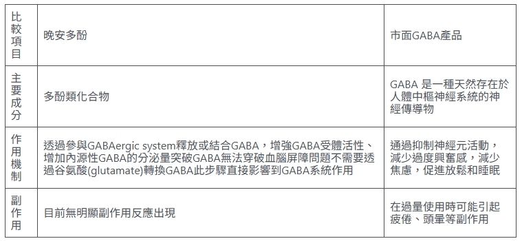 晚安多酚與市面上GABA最大的差別在調節睡眠機制不同,比起傳統單一補充GABA更能緩和焦慮情緒、促進睡眠及增強GABA在體內作用效果。