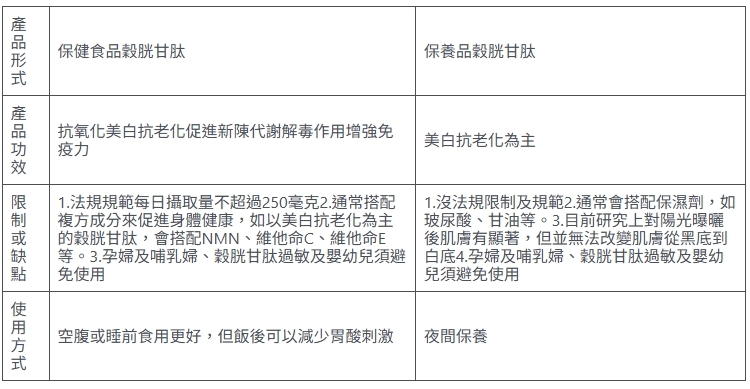 穀胱甘肽在保健食品和重疊,但受到的法規及目的有所不同。在保健食品裡穀胱甘肽被法規規範建議每日攝取量不超過250毫克,而保養品並無添加量限制。以穀胱甘肽保健品來說,通常會以增強免疫力、促進新陳代謝、肌膚美白為主,並需要與相同目的的原物料成分一起搭配,來促進身體健康。保養品含有穀胱甘肽僅單純為了美白及抗老化,搭配其他保濕劑來維護肌膚健康。