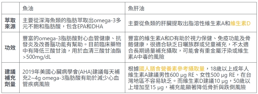 很常有人將魚油跟魚肝油搞錯,雖然名稱相似,但在主要成分、健康功效存在顯著上的差異,可以依照自身的需求和專業營養師建議來挑選。