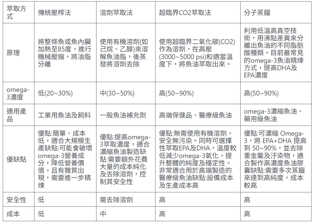 魚油脂的萃取方式受到純度、品質及營養成分的影響,以下用表格來說明各種萃取方式的優缺點。