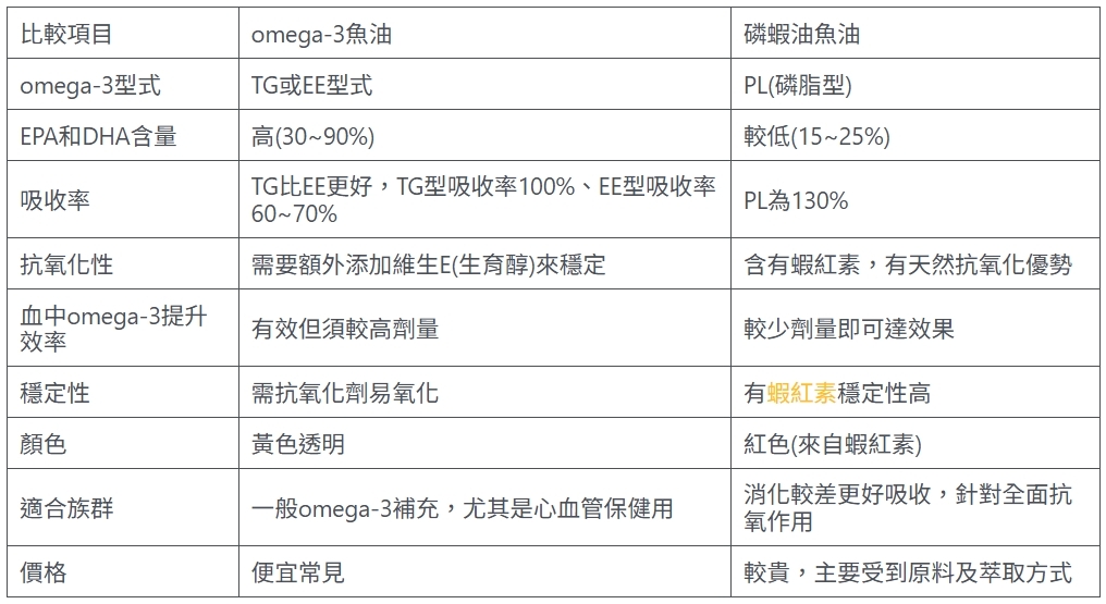 omega-3魚油與磷蝦魚油都是常見補充來源,但可以依照結構、吸收率、抗氧化能力和適合族群之間有所差異,可以依照自己個人的需求來挑選購買。
