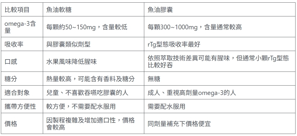 魚油軟糖跟膠囊主要差在劑型、吸收方式、適合對象及口感,主要取決於你所在意的方向。