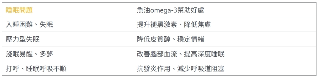 目前全球顯示約80%的人有憂鬱、失眠和焦慮問題,魚油中EPA能夠調節情緒荷爾蒙,促進多巴胺、血清素的分泌,讓睡前更放鬆、減輕壓力,因此提出睡前吃魚油的好處就是能改善睡眠品質。在2019年一項研究指出憂鬱和失眠可能與神經系統發炎有關,能緩解小孩過動症症狀,提升孩子的注意力和警覺性,調節免疫系統,減緩認知衰退、關節疼痛和心血管疾病,間接改善睡眠品質和心理健康。