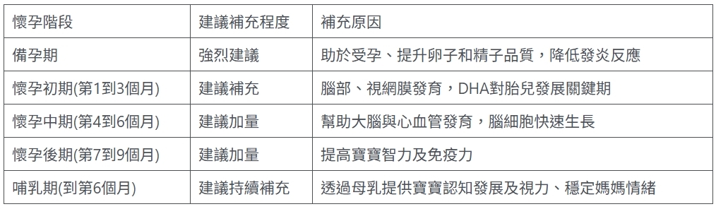 A:孕婦魚油推薦DHA比例高產品,可以持續補充到哺乳期6個月以上,除了幫助胎兒及寶寶正常健康發育,還能幫助媽媽穩定情緒、恢復體力,降低產後憂鬱風險。
