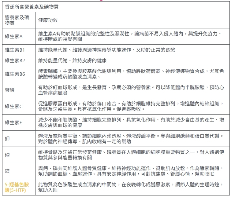 香蕉中的5-羥基色胺酸(5-HTP),順利通過血腦屏障(Blood-brain barrier, BBB),提升大腦中血清素濃度,以便在夜晚進一步轉換成腿黑激素。腿黑激素為人體調節生理時鐘的重要激素,當夜晚提高濃度能促進入睡,預防失眠。
