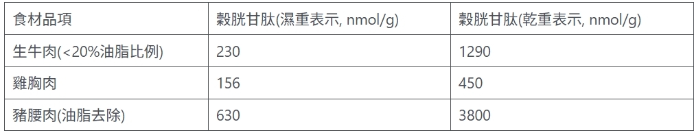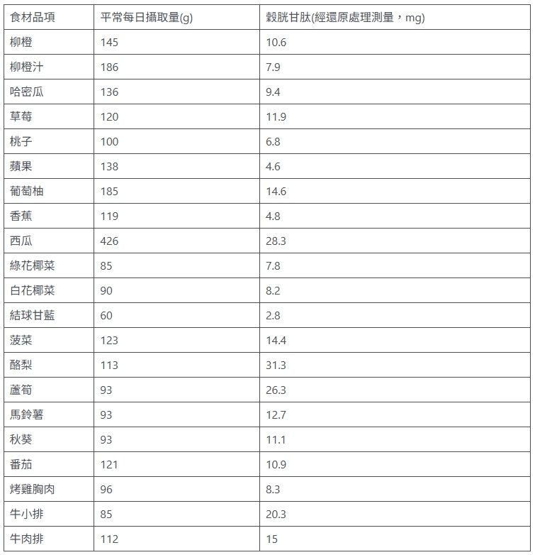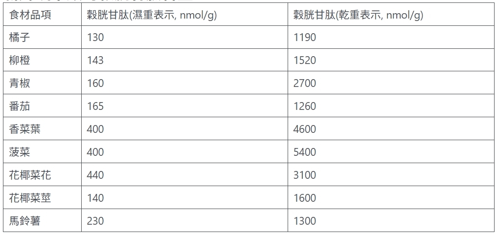 目前穀胱甘肽研究的進展在一項食品成分及分析研究(Journal of Food Composition and Analysis)裡,針對秋冬當地的蔬果分析穀胱甘肽含量。在蔬果類黃綠色明顯比較高,如橘子、柳橙、花椰菜莖、青椒、番茄、白花椰、馬鈴薯。在肉類裡,雞肉、豬肉及牛肉比魚肉更多穀胱甘肽,而乳製品、雞蛋及奶油幾乎沒有穀胱甘肽含量。在烹調過程中是否會流失過多的穀胱甘肽,損失大約25~50%含量。以下用表格來顯示在含量多穀胱甘肽的新鮮食材上的含量。
