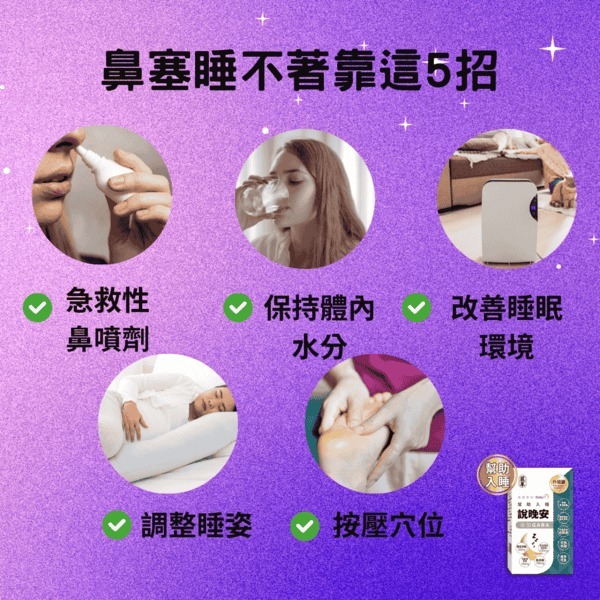 A:鼻子塞住可以嘗試調整睡姿、溫熱毛巾敷在鼻子和額頭、保持充足水分,過於不適可以使用鼻噴劑來緩解當下鼻塞狀況幫助睡眠。