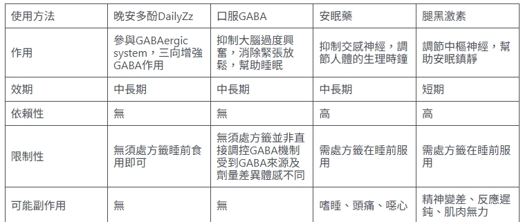 晚安多酚DailyZz透過GABAergic system增強GABA作用,調整體質達到長期的功效。不同於市面上的GABA產品、安眠藥及腿黑激素,安全性高沒副作用,且不會成癮,適合作用改善睡眠的優先選擇。搭配飲食及生活習慣的調整,提升睡眠品質,事半功倍。