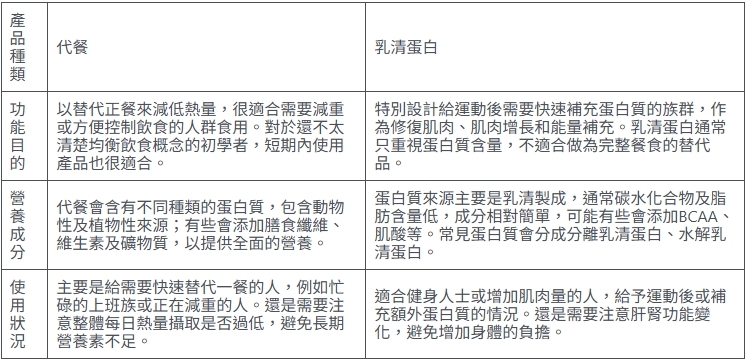 代餐與乳清蛋白主要的差異在於功能目的、營養成分及使用狀況,兩種產品在某種程度上幫助控制體重,可以根據自己的需求和生活模式來決定適合自己的產品。