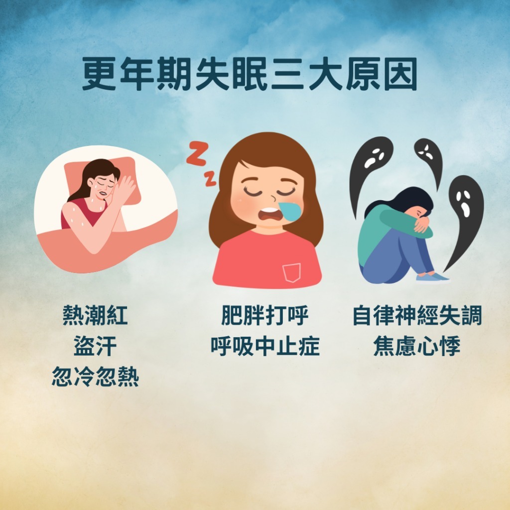 更年期的雌激素及黃體酮開始大幅下降,出現熱潮紅及盜汗影響到睡眠品質。同時褪黑激素也與睡眠有直接相關,隨著年紀的增加褪黑激素越來越少。
