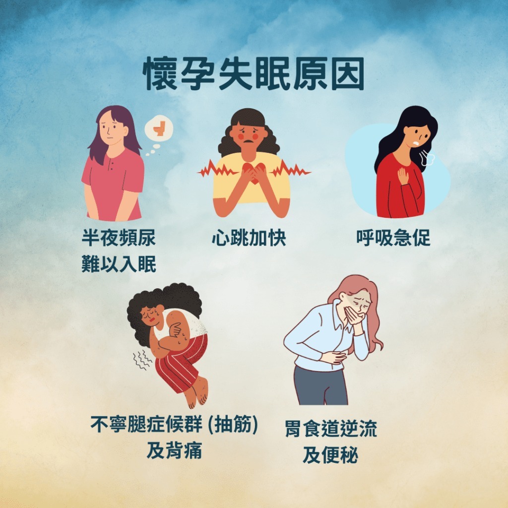 隨著胎兒越來越大,擠壓到子宮、肺臟及橫隔膜,呼吸需要用力。睡眠過程需要找出舒適位置呼吸順暢,更增加失眠的機率。