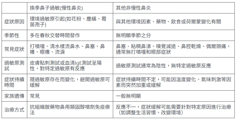 換季鼻子過敏(慢性鼻炎)和其他非慢性鼻炎之間的最大區別,以下用表格來說明。