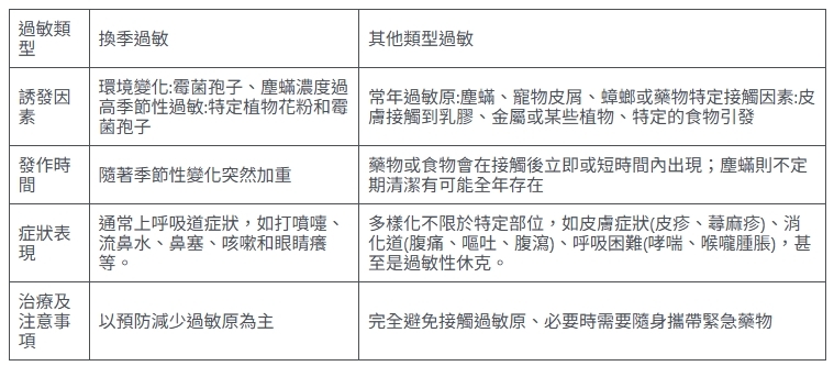 換季過敏與其他類型過敏的差異主要在誘發因素及發作時間點不同,兩者皆是免疫系統為保護身體的過度反應,因此兩者皆有風險同時存在。