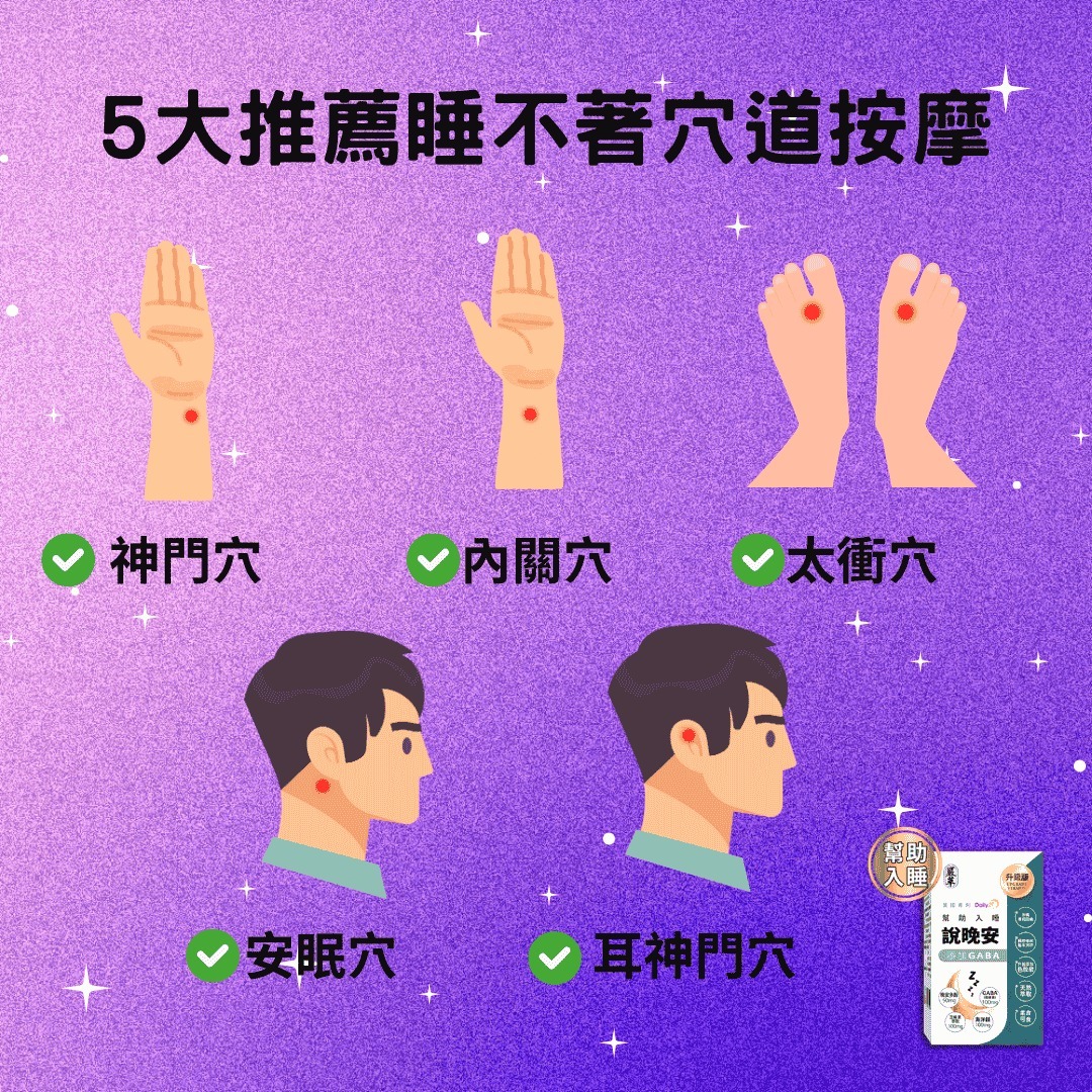 睡不著穴道有神門穴、內關穴、太衝穴、安眠穴跟耳神門穴,多按摩並注意可耐受力道,必要時尋求中醫師針灸療法,搭配其他輔助促進睡眠,如泡腳熱毛巾促進循環、深呼吸放鬆。平時可以多補充晚安多酚穩定情緒。