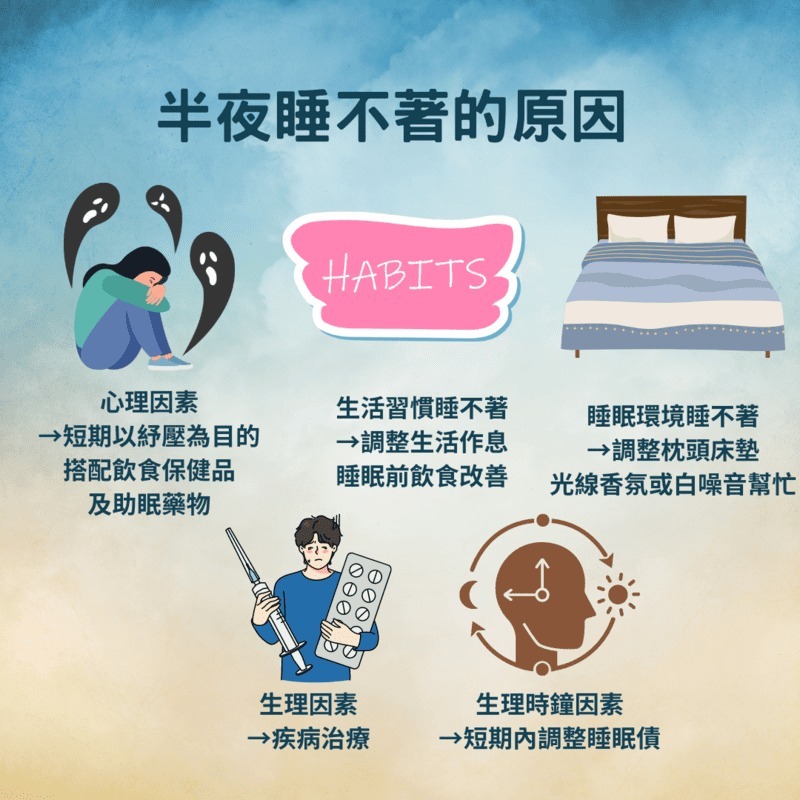 晚上睡不著初期可以先自行判斷睡不著的原因,通常會依時間長短作分類。