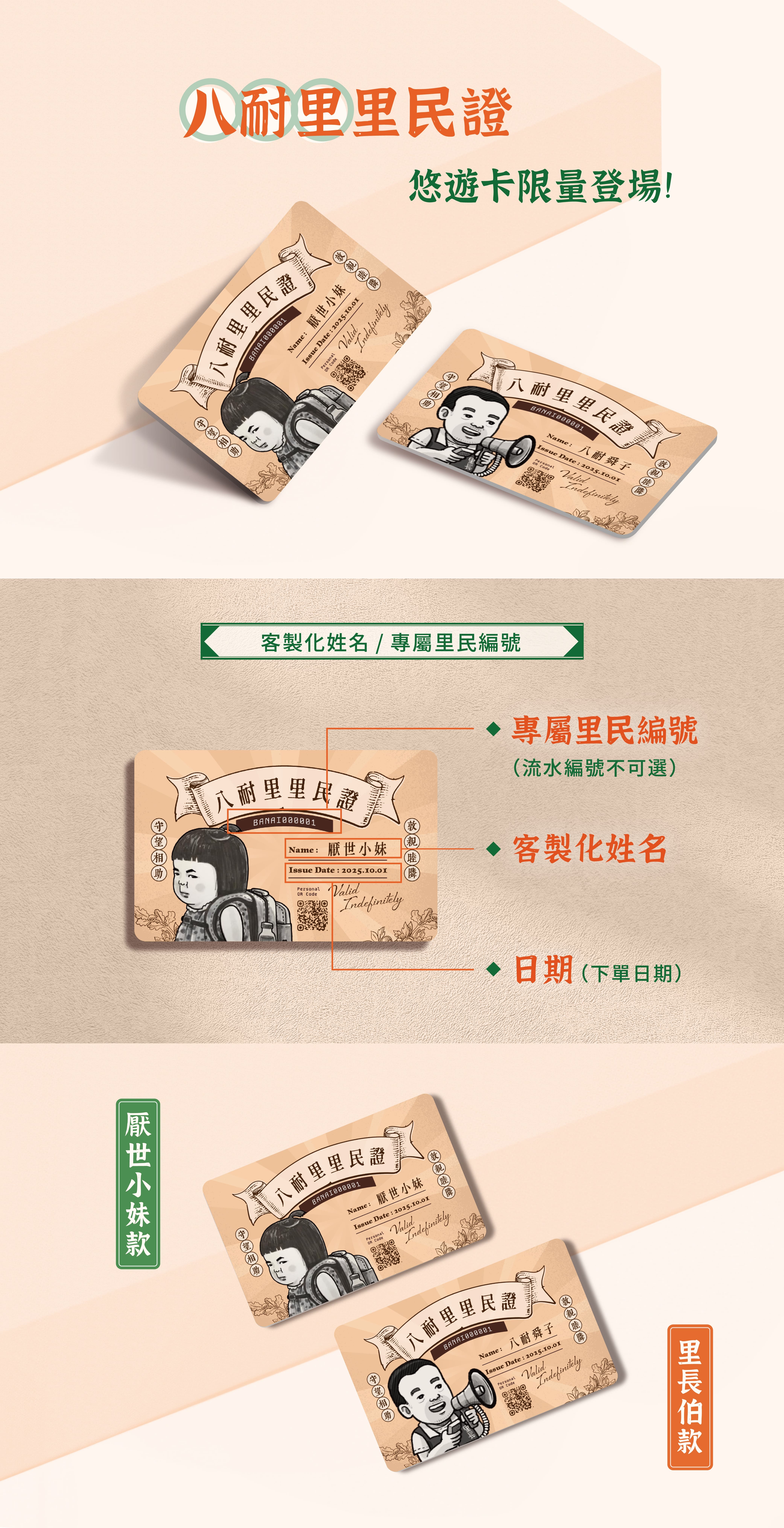 可客製姓名並印有專屬里民編號,收藏你的八耐身分,正式成為八耐里的一員!