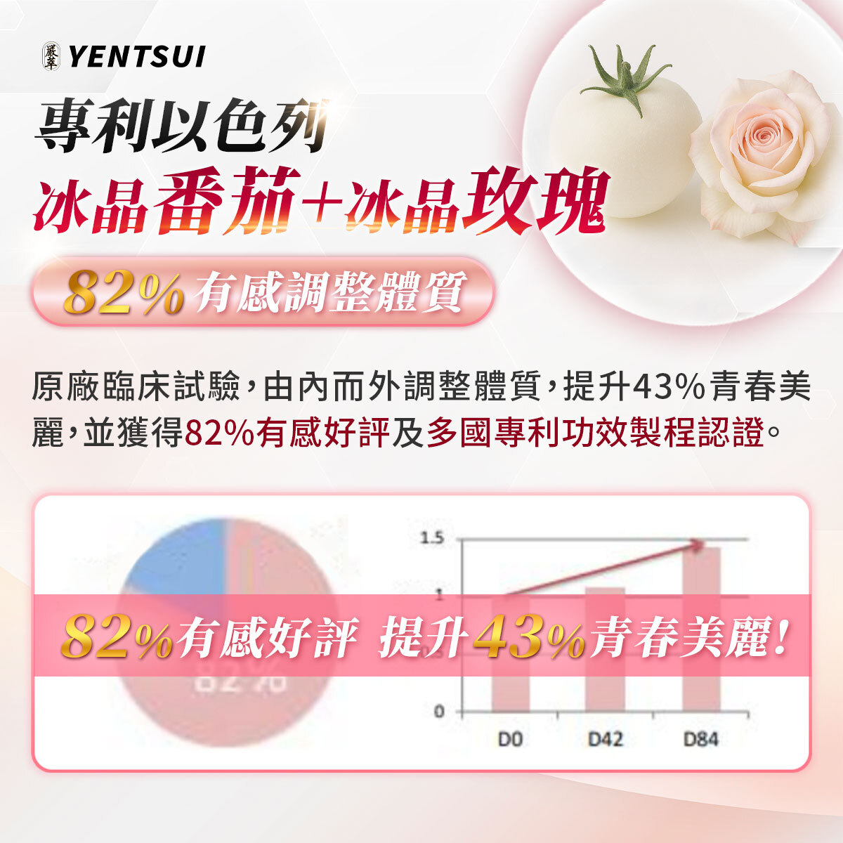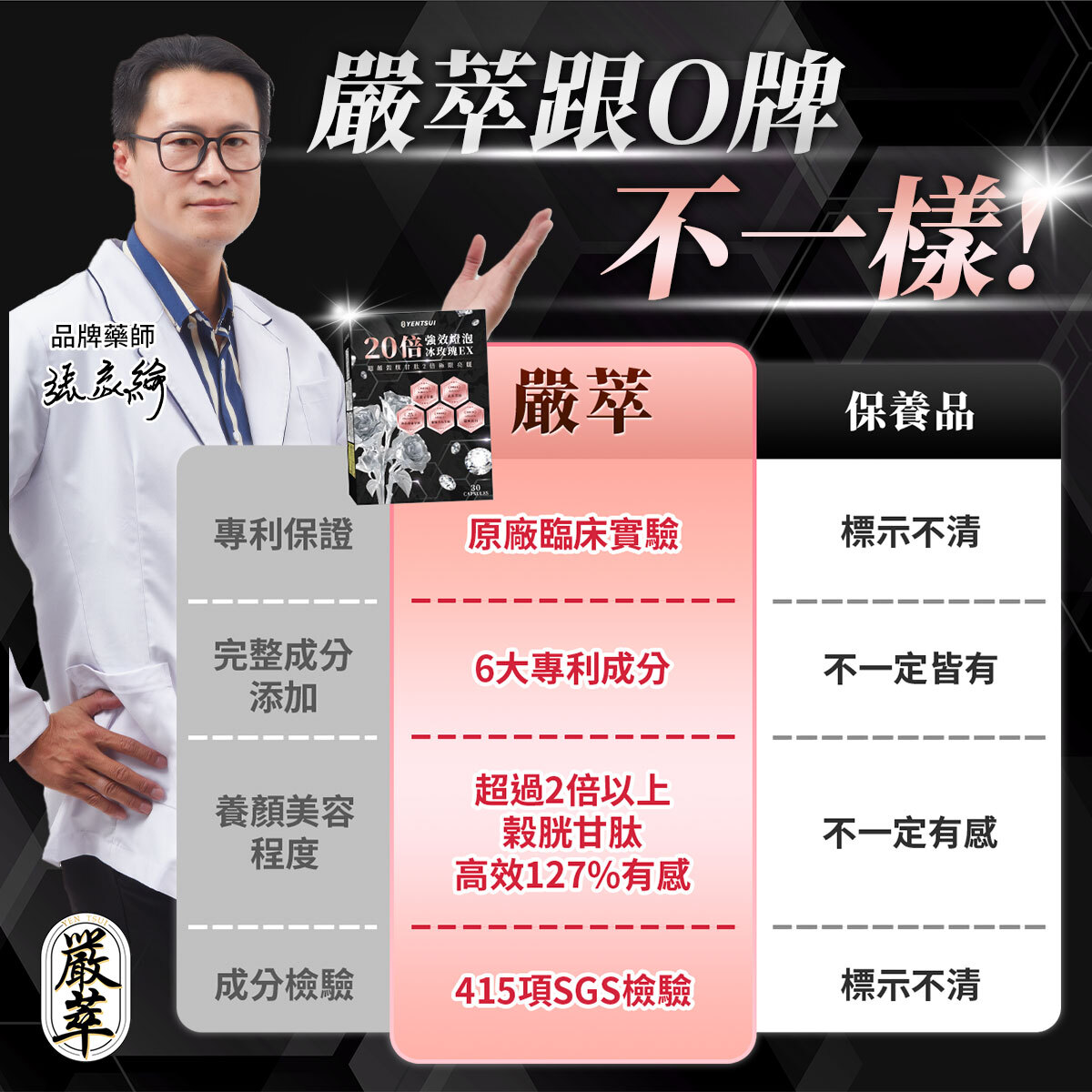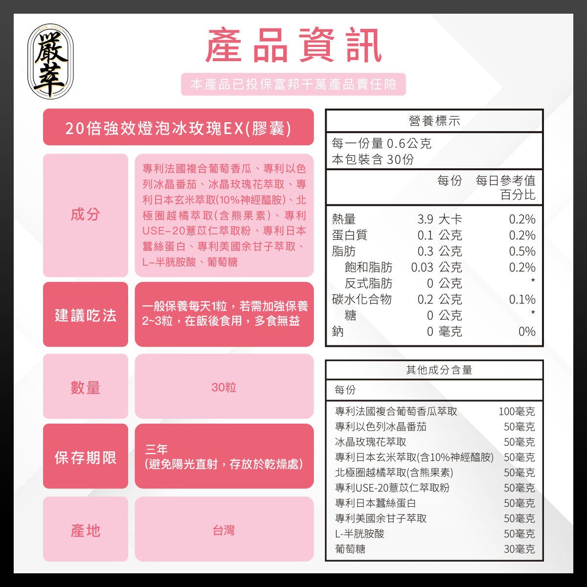 ✔ 20倍強效冰玫瑰EX,6大專利成分,亮麗超越穀胱甘肽2倍。