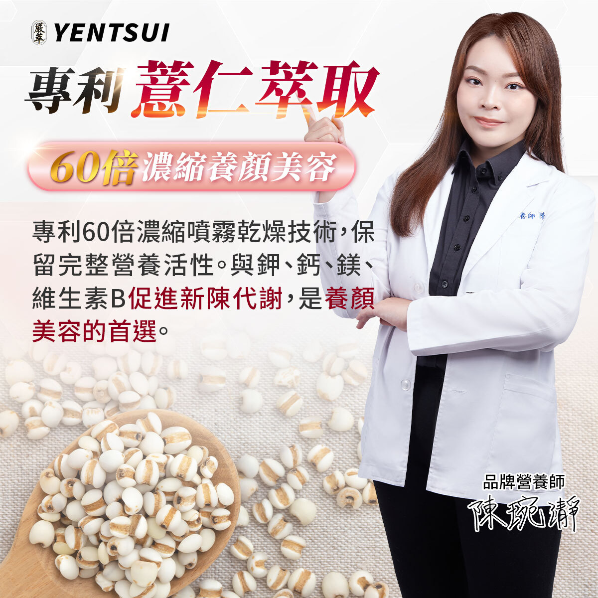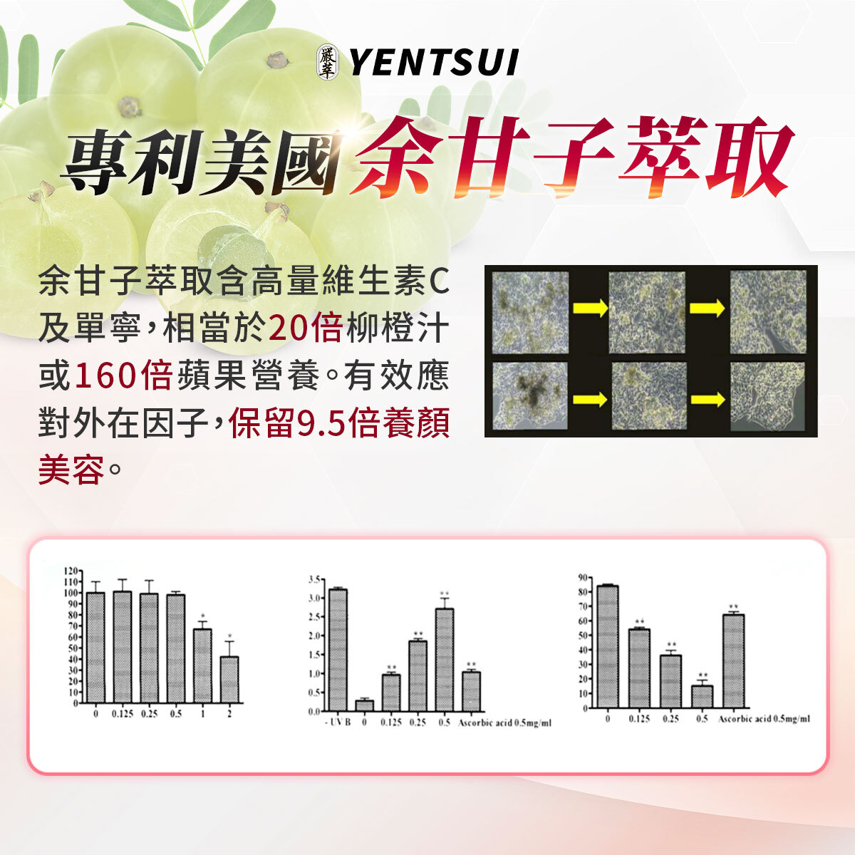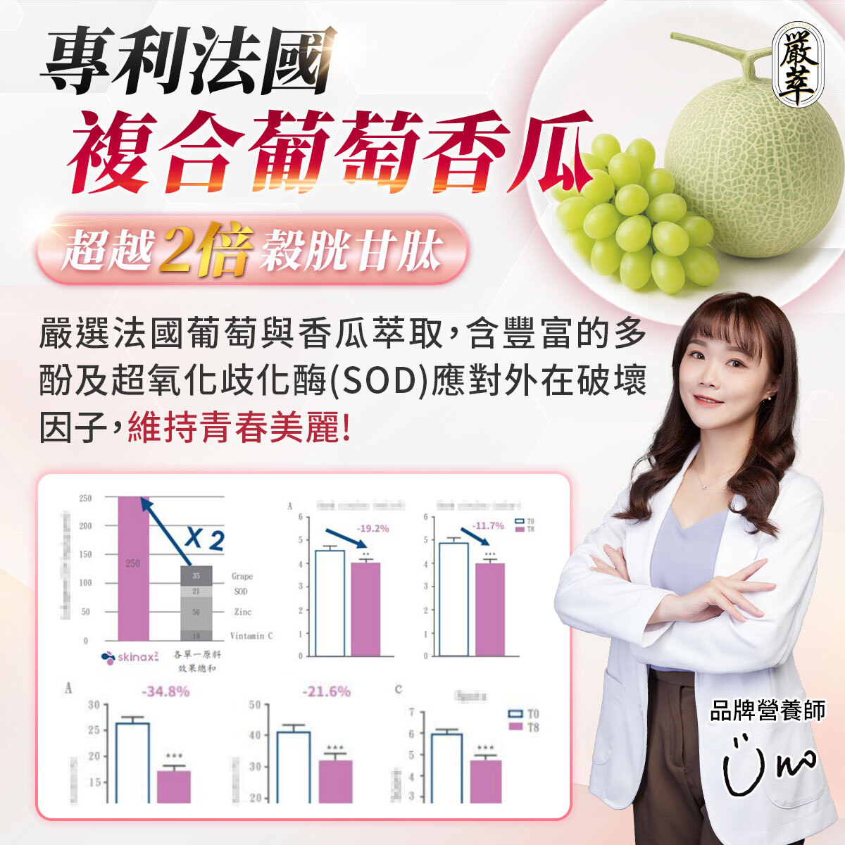 ✔ 葡萄香瓜、冰晶番茄、蠶絲蛋白、余甘子、薏仁、玄米萃取,全方位護理。